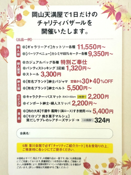 【第42回 愛のチャリティバザール開催のお知らせ】 この度、岡山天満屋様のご協力をいただき「愛のチャリティバザール」を開催いたします。収益金は地域社会と世界の女性と女児の生活向上を目的とした奉仕事業に役立てます。 ご多用のこととは存じますが、皆さまお誘い合わせのうえ、ご来場賜りますよう会員一同心よりお待ち申し上げております。                              岡山天満屋 6階葦川会館 10月13日(月・祝)午前10時〜午後5時