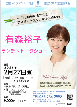 国際ソロプチミスト岡山は1971年に日本で10番目のクラブとして認証されてから55年間、皆様にご指導ご協力をいただきながら地域社会と世界の支援を必要としている多くの方たちの生活向上をめざし奉仕活動を行ってまいりました。55周年という節目を迎えるにあたりこれまでの歩みを振り返り、オリンピックメダリストとして世界の舞台で活躍され現在も幅広い分野で挑戦を続ける有森裕子氏をお迎えして、ランチ&トークショーを開催します。先日「岡山市市民栄誉賞」を受賞された有森氏から 「心と身体を鍛える」ことをテーマに、アスリートならではの視点から、日々の生活に役立つウェルネスの秘訣をわかりやすくお話しいただきます。